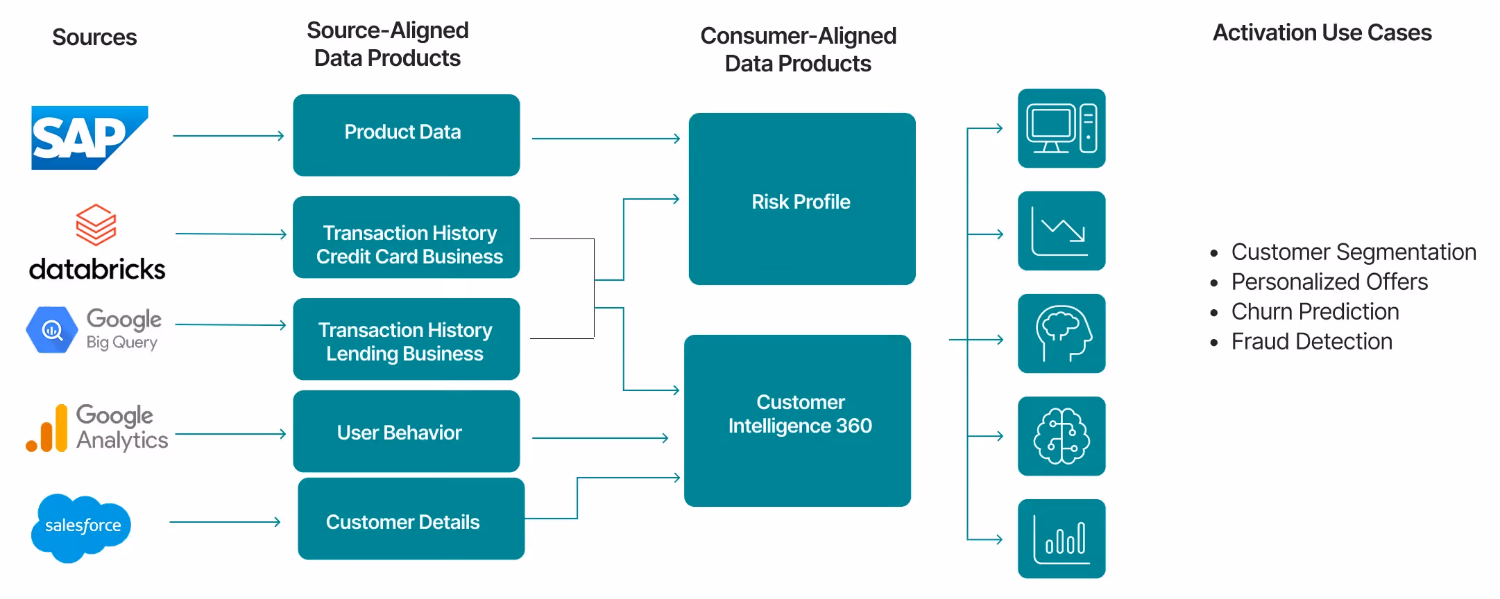 Consumer-aligned data products: These solve specific business problems, delivering outcomes like Lead Scoring, Campaign Attribution, or Customer Segmentation to business users, applications, or dashboards.