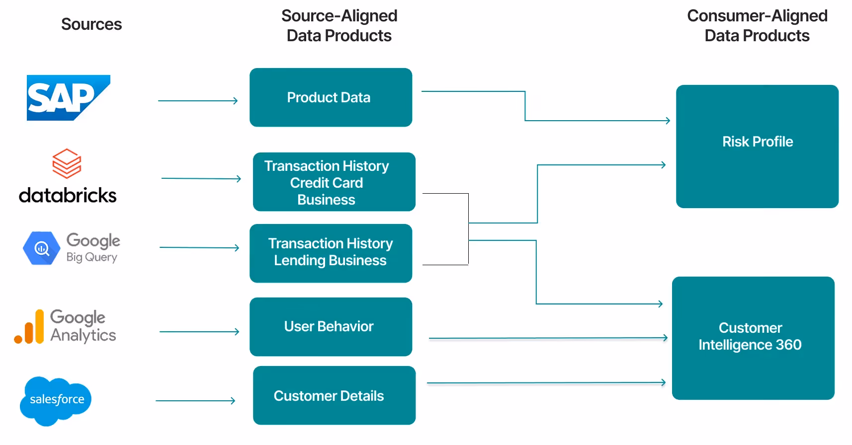 The audience for a source-aligned data product is other data products and data teams. Source-aligned data products serve as building blocks. When you build a consumer-aligned data product like Risk Profile, it pulls from multiple source-aligned data products rather than connecting directly to raw source systems. The Product Data and Customer Details source-aligned data products feed the Risk Profile data product, which then serves the business user. In the example above, you might build separate source-aligned data products like Product Data (from SAP), Customer Details (from Salesforce), Transaction History (from Databricks and Big Query), and User Behavior (from Google Analytics). Each is its own data product, representing one or more source systems that have been cleaned and governed, ready to feed downstream data products